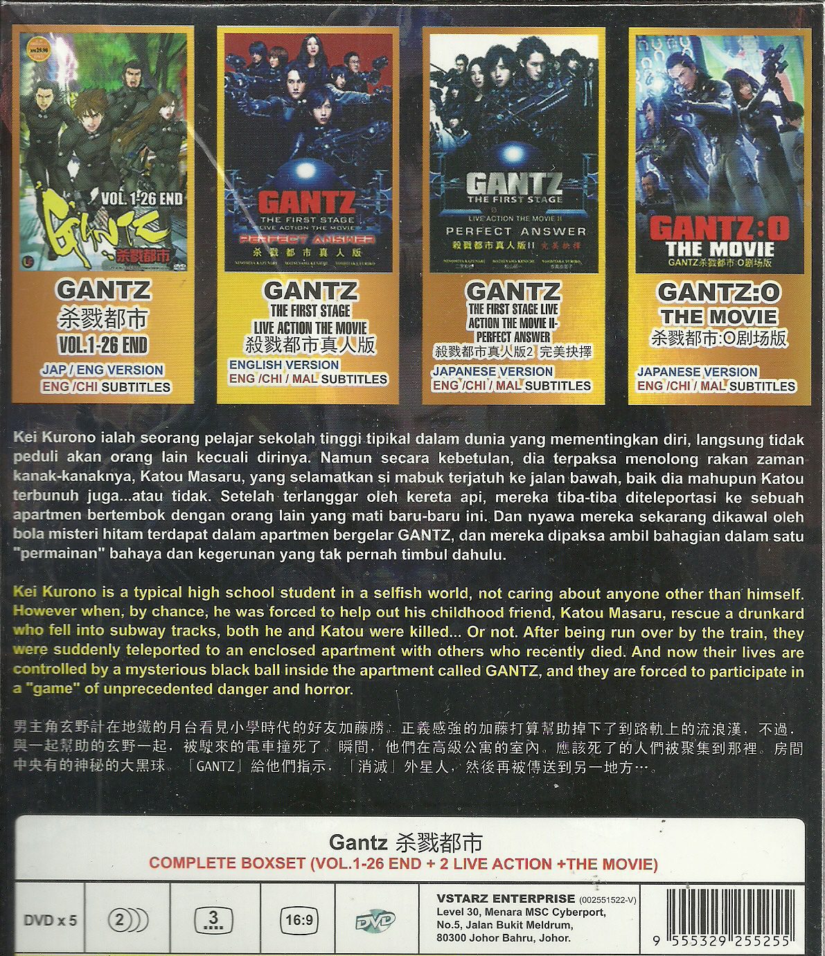 | Version@Language : | Japanese / English ( TV Dubbed in Japanese / English only ) ( The First Stage Live Action Movie Dubbed in English only ) ( The First Stage Live Action Movie II + Gantz : O The Movie Dubbed in Japanese only ) |