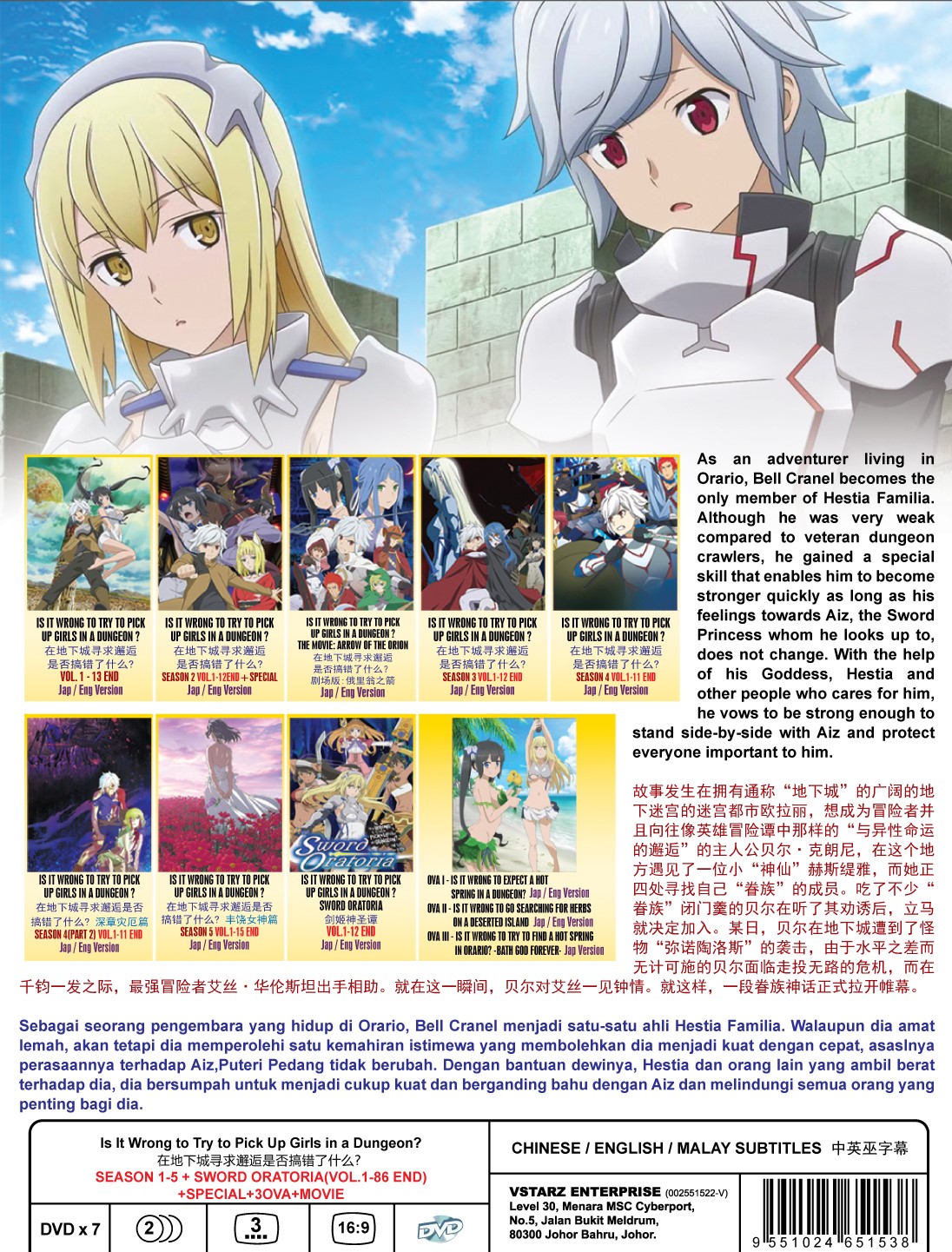 As an adventurer living in Orario, Bell Cranel becomes the only member of Hestia Familia. Although he was very weak compared to veteran dungeon crawlers, he gained a special skill that enables him to become stronger quickly as long as his feelings towards Aiz, the Sword Princess whom he looks up to, does not change. With the help of his Goddess, Hestia and other people who cares for him, he vows to be strong enough to stand side-by-side with Aiz and protect everyone important to him.