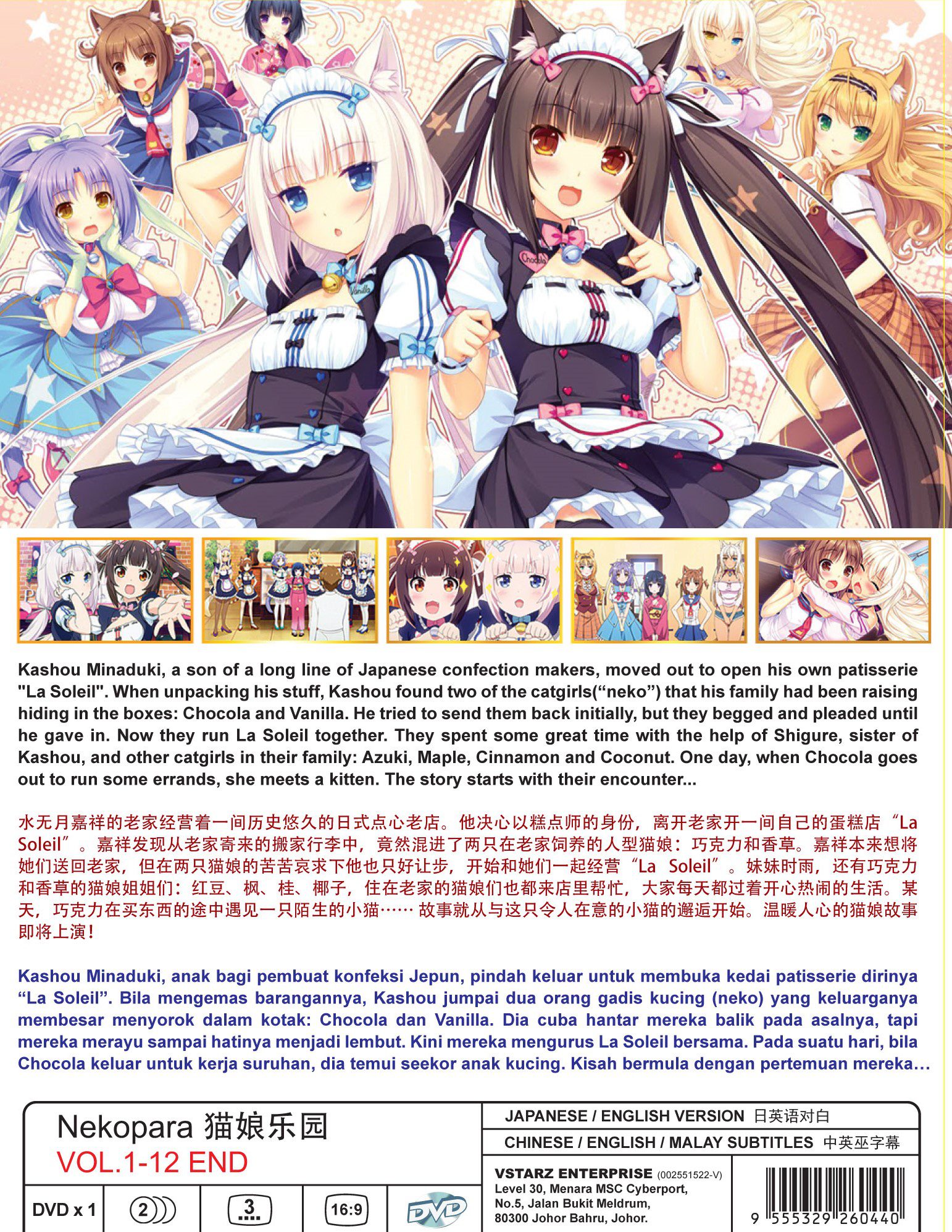 Kashou Minaduki, a son of a long line of Japanese confection makers, moved out to open his own patisserie “La Soleil”. When unpacking his stuff, Kashou found two of the catgirls(“neko”) that his family had been raising hiding in the boxes: Chocola and Vanilla. He tried to send them back initially, but they begged and pleaded until he gave in. Now they run La Soleil together. They spent some great time with the help of Shigure, sister of Kashou, and other catgirls in their family: Azuki, Maple, Cinnamon and Coconut. One day, when Chocola goes out to run some errands, she meets a kitten. The story starts with their encounter…