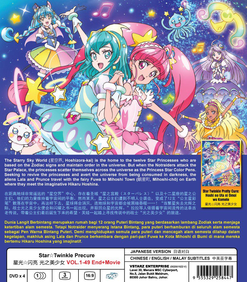 The Starry Sky World (星空界, Hoshizora-kai) is the home to the twelve Star Princesses who are based on the Zodiac signs and maintain order in the universe. But when the Notraiders attack the Star Palace, the princesses scatter themselves across the universe as the Princess Star Color Pens. Seeking to revive the princesses and avert the universe from being consumed in darkness, the aliens Lala and Prunce travel with the fairy Fuwa to Mihoshi Town (観星町, Mihoshi-chō) on Earth where they meet the imaginative Hikaru Hoshina. Receiving a Star Color Pendant and one of the Star Color Pens, Hikaru transforms into the legendary PreCure, Cure Star. Joined by Lala and two other girls, Elena and Madoka, as well as the shapeshifting cat-like alien, Yuni, Hikaru leads the Star Twinkle PreCure as they seek to revive the Star Princesses and fight against the Notraiders.