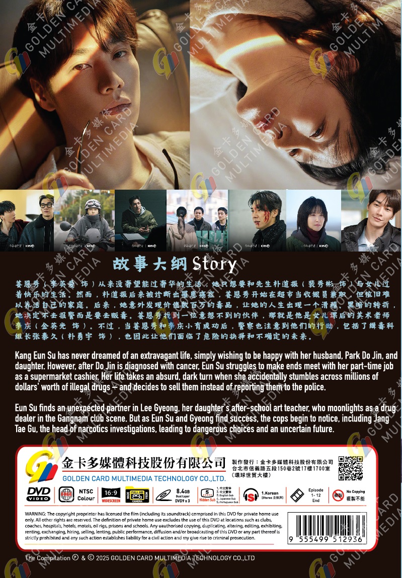 “Kang Eun Su has never dreamed of an extravagant life, simply wishing to be happy with her husband, Park Do Jin, and daughter. However, after Do Jin is diagnosed with cancer, Eun Su struggles to make ends meet with her part-time job as a supermarket cashier. Her life takes an absurd, dark turn when she accidentally stumbles across millions of dollars’ worth of illegal drugs – and decides to sell them instead of reporting them to the police.